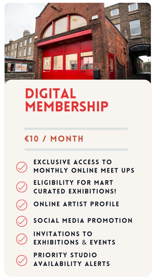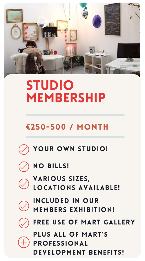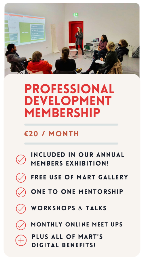 With over 150 Members, MART is one of Irelands largest and longest running Artist led arts organisations. Join our community to gain development supports and benefits to assist your professional artistic career. MART began in 2007 and has supported its members and hundreds of artists through national and international exhibitions, art fairs, projects, talks, workshops, professional development opportunities and since 2013 has become one of Irelands largest of studio workspace providers.