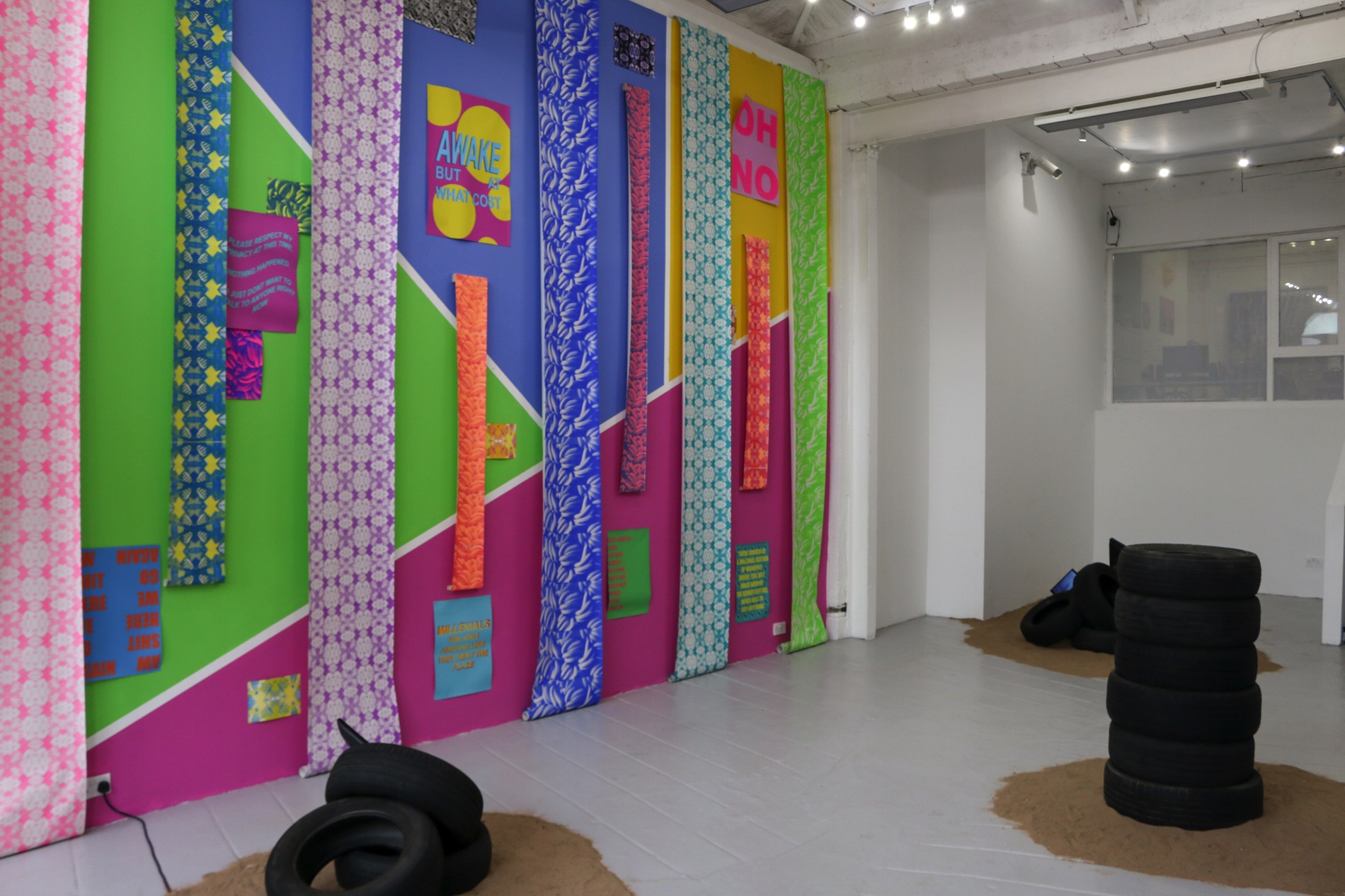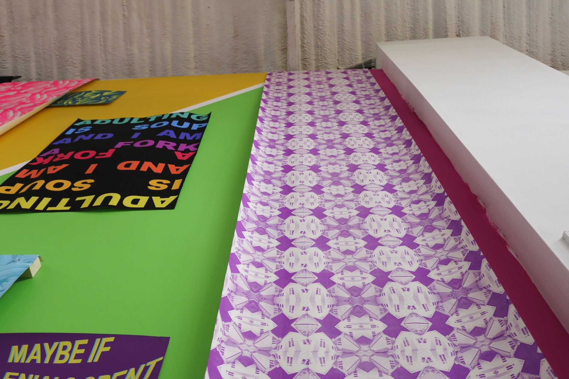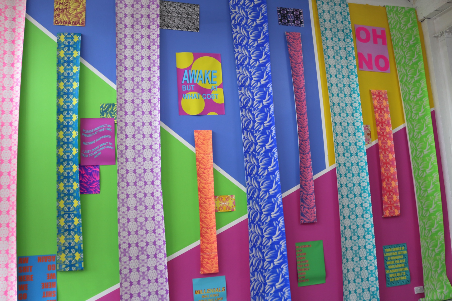 The work employs the use of expanded print installation by completely taking over blank space with large screen prints. The installation of the prints and its use of pattern and colour is used to echo a visual energy within the space and submerge the viewer into the art itself. The work is characterised by use of bright colour with strong ironic humoured text. Carrie-Anne’s work is a response to the online reactions of millennials towards current social issues as well as the absurdist humour placed around them. Using repetitive pattern and bright colours, she brings light to social issues by creating relatable content. During exhibitions Carrie-Anne remains within the space listening to the audiences’ response and reaction to her work, which is imperative to further fuelling her concept research and aiding the creation of new prints and on-going works.