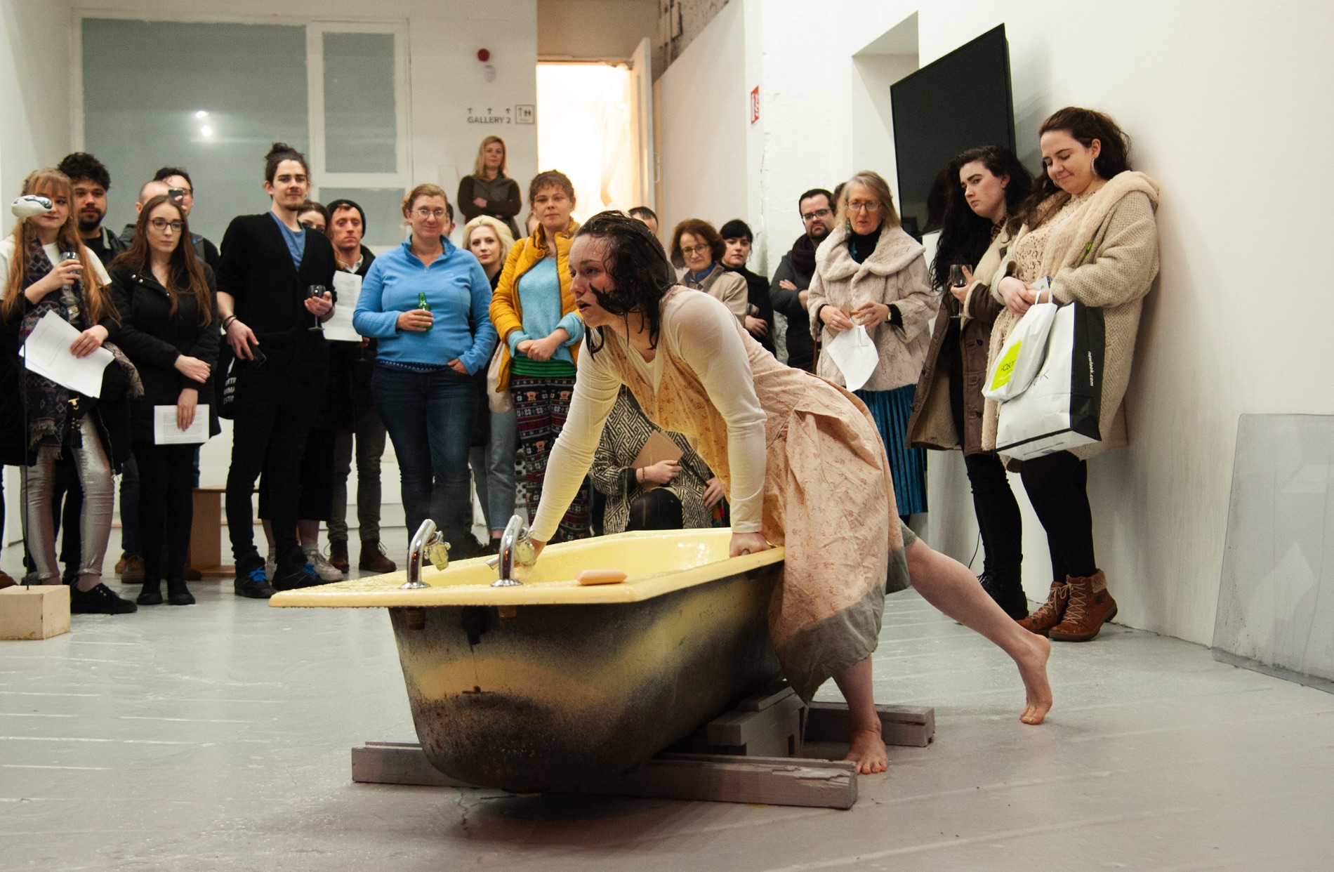 The work explored the dangerous axis of the female body as object, amplifying this through the chosen mediums of performance and video, with the performance space acting as a developing installation. Simultaneously, the work occupies the body as a moving sculpture due to the spectator relationship between the audience and the work. The perturbed body licenses the unsettles tempo of the performance which transitions from meditative stillness to frantic action, disturbing the perceived tranquillity within the space and in turn, abruptly presenting the dystopia.