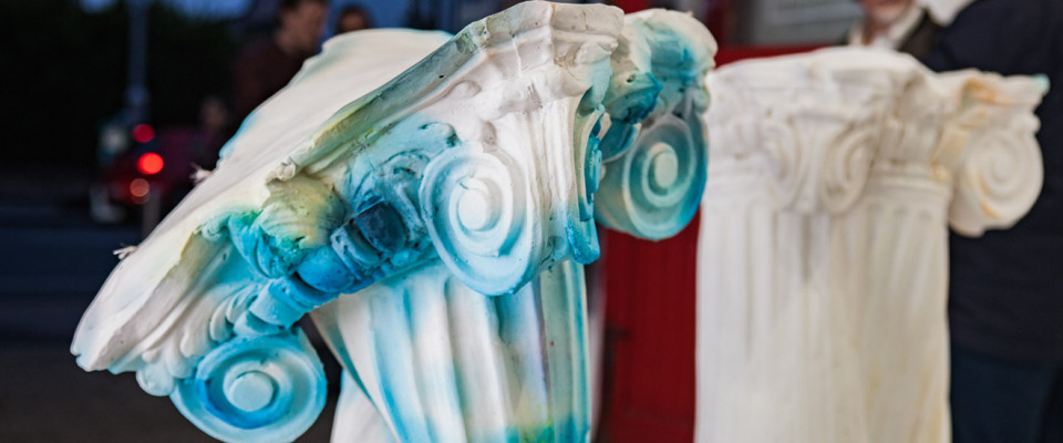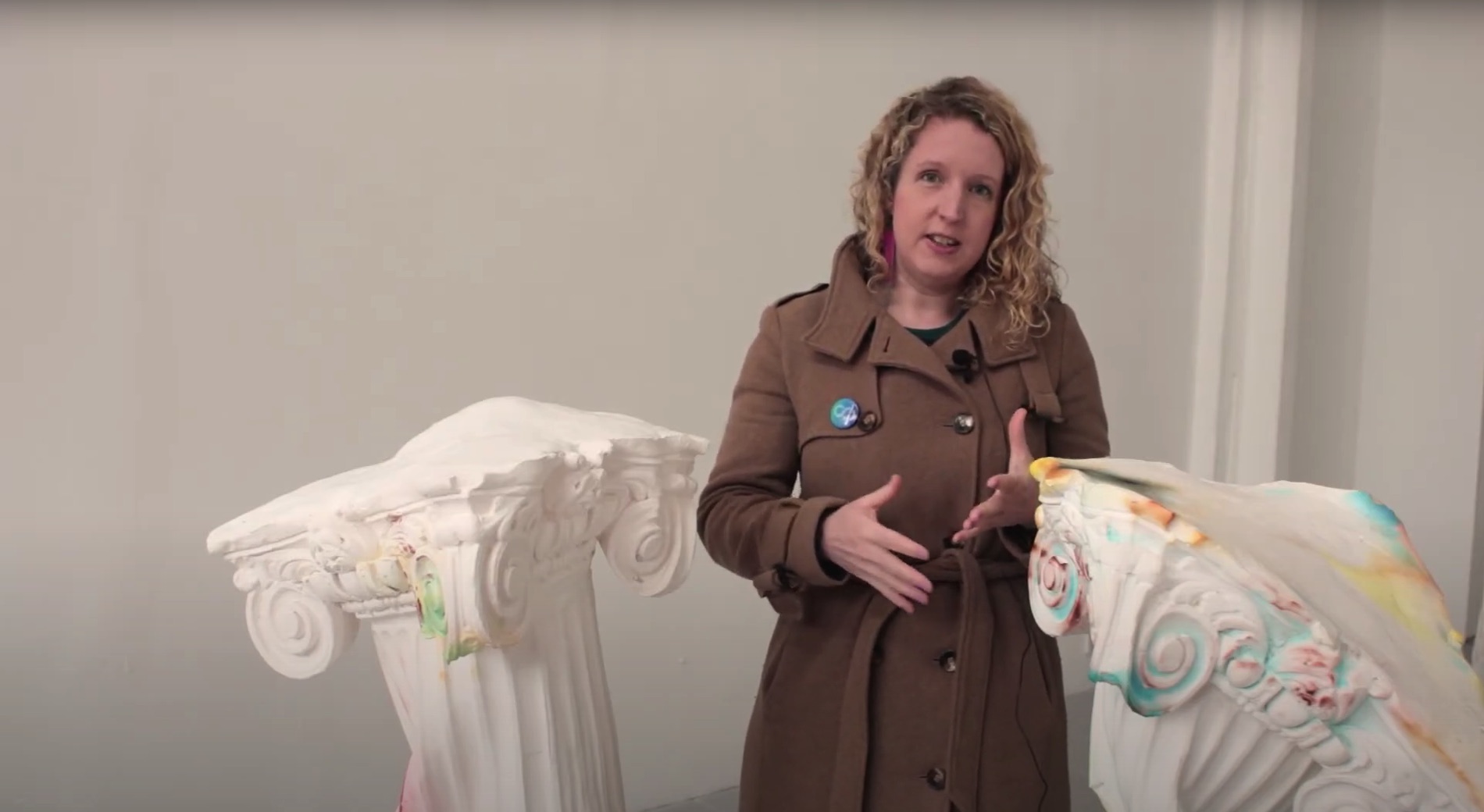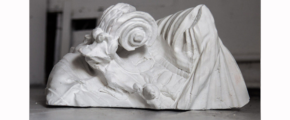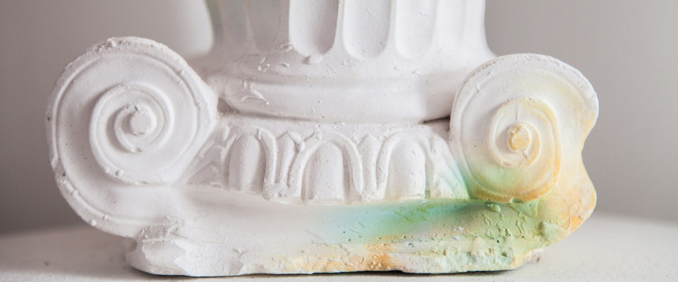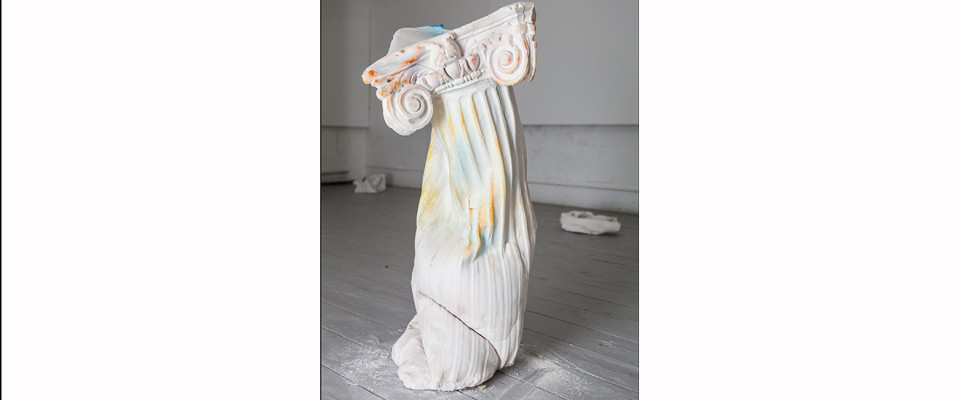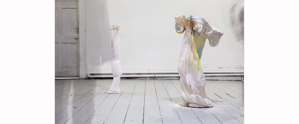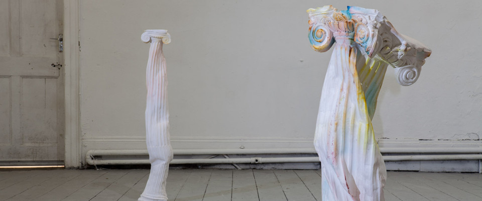 Despite being built since the 18th century, this ubiquitous style aims to cite antiquity, evincing a sense of timelessness and purity. Aesthetically, they function as signifiers of power and prestige. Ni Ghrioghair recognises them as architectural societal introjects, bestowing inherited values onto their denizens. However, as rehashed pastiches of ancient Greek and Roman architecture, she also views them as unreliable translations. A set of arbitrary aesthetics, removed from their original meaning, around which we twine the fictions of our contemporary life. For recent sculptures, she took latex casts of various architectural details of Dublin Castle. Normally these classical columns stand solid and erect. However, after the plaster is cast in an unsupported latex mould, the pillars became flaccid and deflated. While faded Georgian grandeur is particular to the history of Dublin, recent international political developments have also reminded us of the inevitable sunderance of empires. Aesthetics of permanence last longer than the power they aspire to represent.