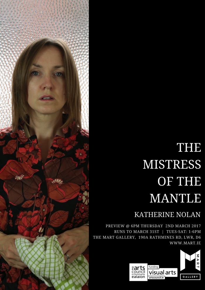 The Mistress of the Mantle is an exhibition of video, photography and performance works that emerged in the context of the artist’s return home. Living in the UK for 10 years, and returning to a life in Ireland, the artist was struck both by a period of personal change, unexpected culture shock and generational difference. This set of artworks act as a means to examine the process of reintegration, and taken for granted socio-cultural attitudes that surface through this renegotiation of identity and gender in an Irish context. As the artist attempts to re-find ‘home’, the self of the past and the present confront each other in crisis.
