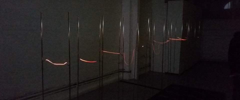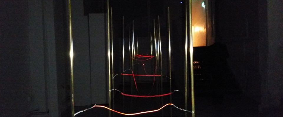 Without a Future is an ongoing research work that develops live electrical current as sculptural form. Commissioning electrical current in this way is in keeping with Margaret O’Brien’s experimental approach to form and materials. Its precarious nature explores ideas of sculpture and art practice as mobile, unfixed and in flux, something fleeting and unsustainable. Originally sited as a temporary outdoor installation, It connects on a fundamental level to relationships between site and subject, context and environment, wherein the activity of the electrons is visibly vulnerable to the climatic conditions of its given space from one moment to the next. The conditions of its being waver from sympathetic to hostile with the smallest breeze, with a slight change in humidity, or a rise or drop in temperature, evidenced by the constant colour change ranging from dullest red to brightest orange.