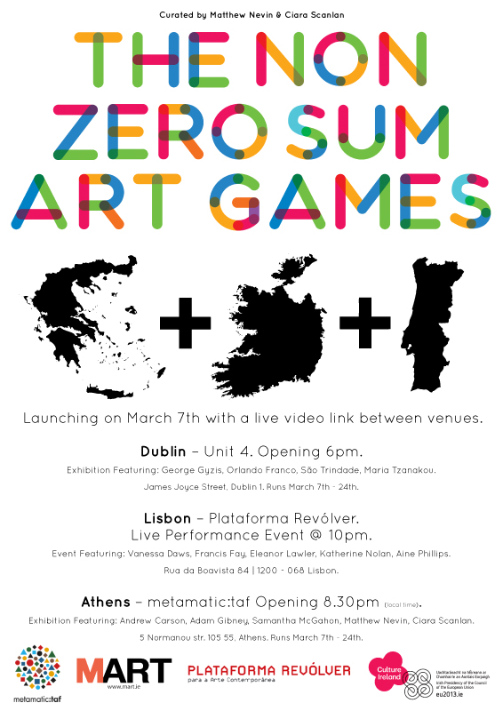 ‘The Non Zero-Sum Art Games’ was a program of exhibitions and performances focusing on the power that Art and people have to transform the socio/political psyche of the public in three European cities; Dublin, Lisbon & Athens all whom have recently hit by financial crisis.