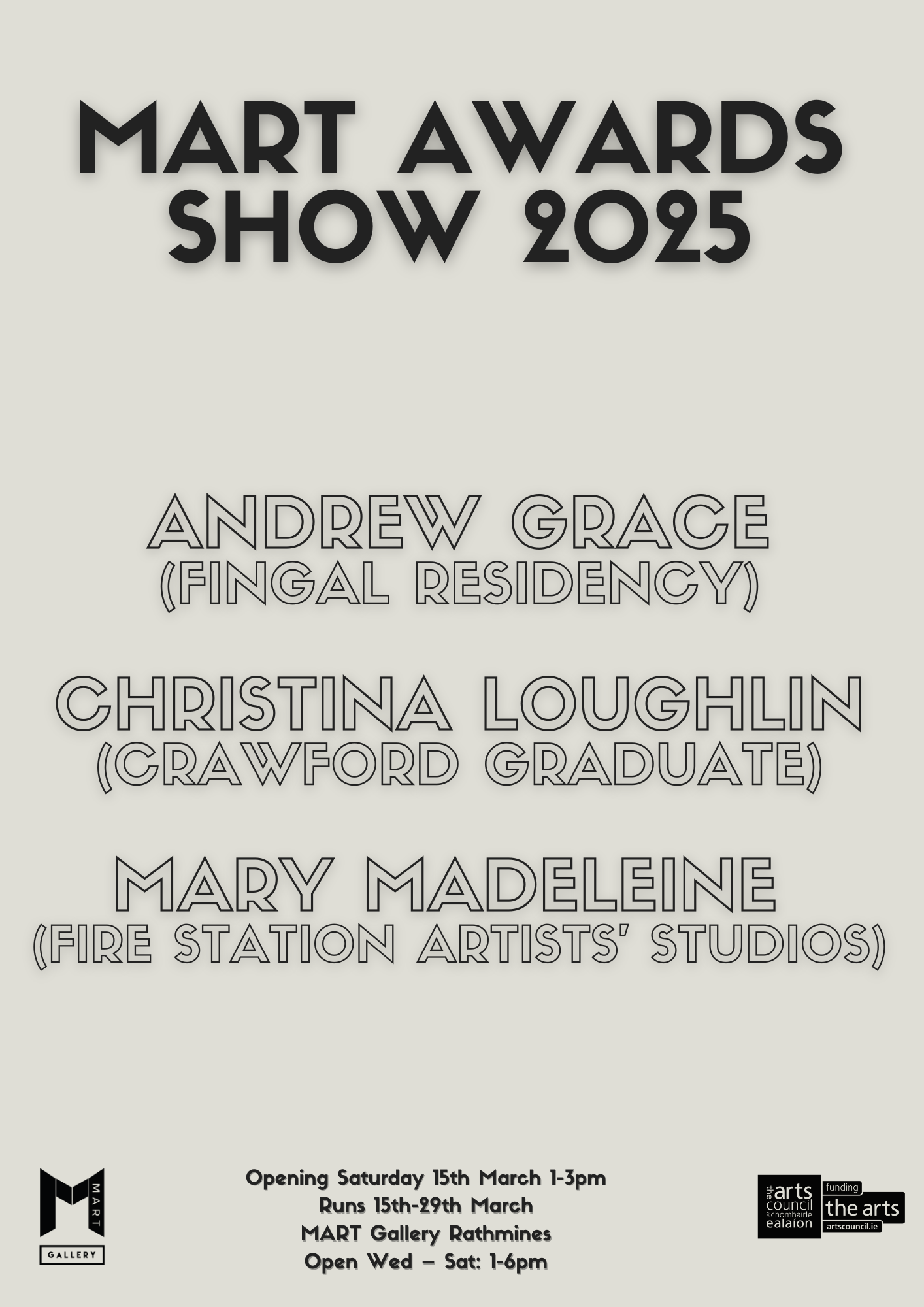 This annual exhibition aims to provide a showcase and support opportunity to artists whose work is both engaging and experimental. The exhibition presents artists selected through partnerships; Andrew Grace was selected from the MART & Fingal Arts Office Graduate Award and successfully received a one year studio at MART Studios alongside curatorial and financial support for the exhibition and Mary Madeleine was selected from Fire Station Artists’ Studios Sculpture Practice Award and Christina Loughlin a recent graduate of MTU Crawford College of Art & Design.