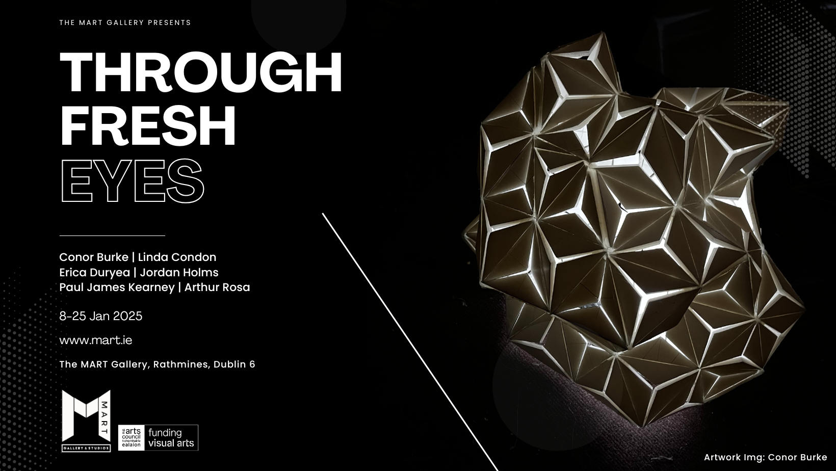 Supported by the Arts Council of Ireland, this exhibition features a dynamic mix of painting, digital, and sculptural works created by talented MART Members. Through Fresh Eyes celebrates the strength of Ireland’s contemporary arts scene and MART’s role in fostering innovation and artistic development.