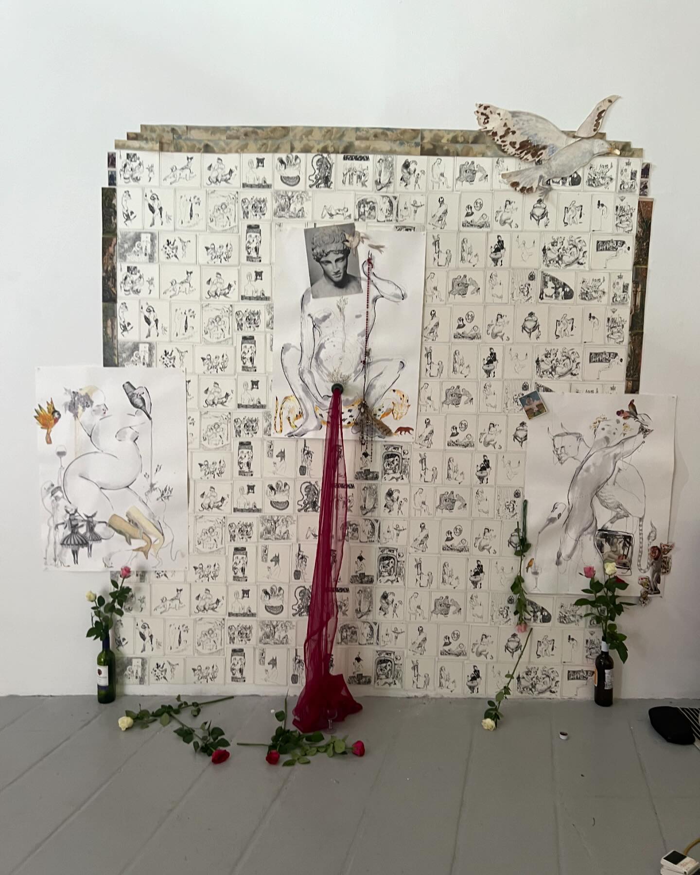 All the artists involved in WINE & DIE participated in the production or post-production of the film Winesploitation (which can be seen in the back gallery throughout the show). This exhibition came out of the low budget collectivity behind the film, with the aim of exposing the relational process of thinking/making/influence around its emergence. It involves photography, painting, sketch art, mixed-media installation and noise music.