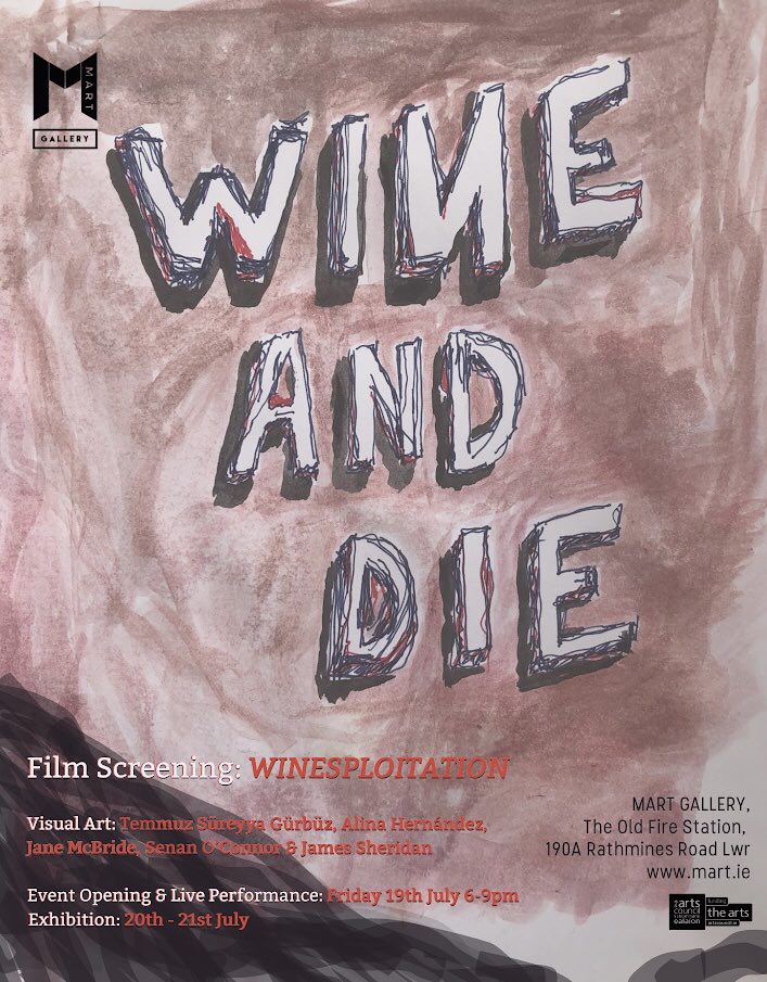 Catch the docufiction film Winesploitation (Gallery 2) and visual arts by Temmuz Süreyya Gürbüz, Alina Hernández, Jane McBride, Senan O’Connor and James Sheridan (Gallery 1).