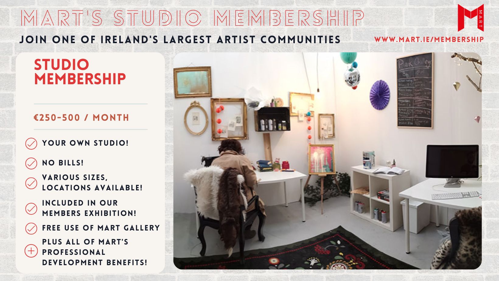 - Receive a 20% discount off when hiring MART venues, such as The MART Gallery in Rathmines or our Project Space in Harolds Cross. These versatile spaces are perfect for hosting an exhibition, showcasing your work, rehearsing performances, or documenting your artwork! [check out here for further hire info and rates]
